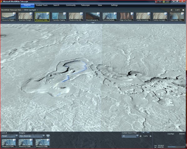 At Monday's 11th annual Microsoft Research Faculty Summit, Microsoft Corp. announced the latest version of its WorldWide Telescope (Web-based software that blends terabytes of images and other data from multiple sources, enabling personal computers to function as virtual telescopes). The software giant also revealed high-resolution, 3-D imagery of Mars stitched together with the help of more than 13,000 pictures captured by a number of NASA's Mars spacecraft, including the Mars Reconnaissance Orbiter (MRO).
