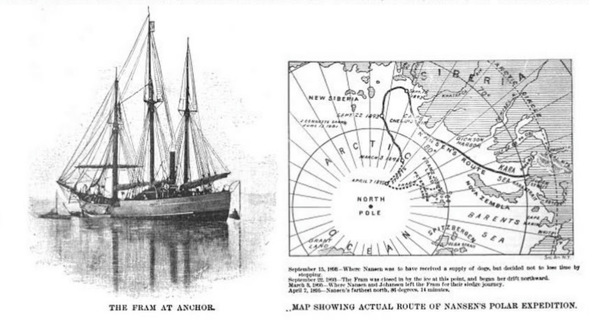 We have in several of our Supplements described the pathetic starting of the expedition from Christiania, the little ship passing close by the explorer's home, where his wife, dressed in white, and the companion of many of his trips, standing on the shore, saw the last of her husband. The theory on which the expedition was based was that ocean currents exist whose direction is from the islands of New Siberia across the North Polar region to Greenland. The Jeannette sank off these islands and it was claimed that relics of the Jeannette were picked up on the shores of Greenland.